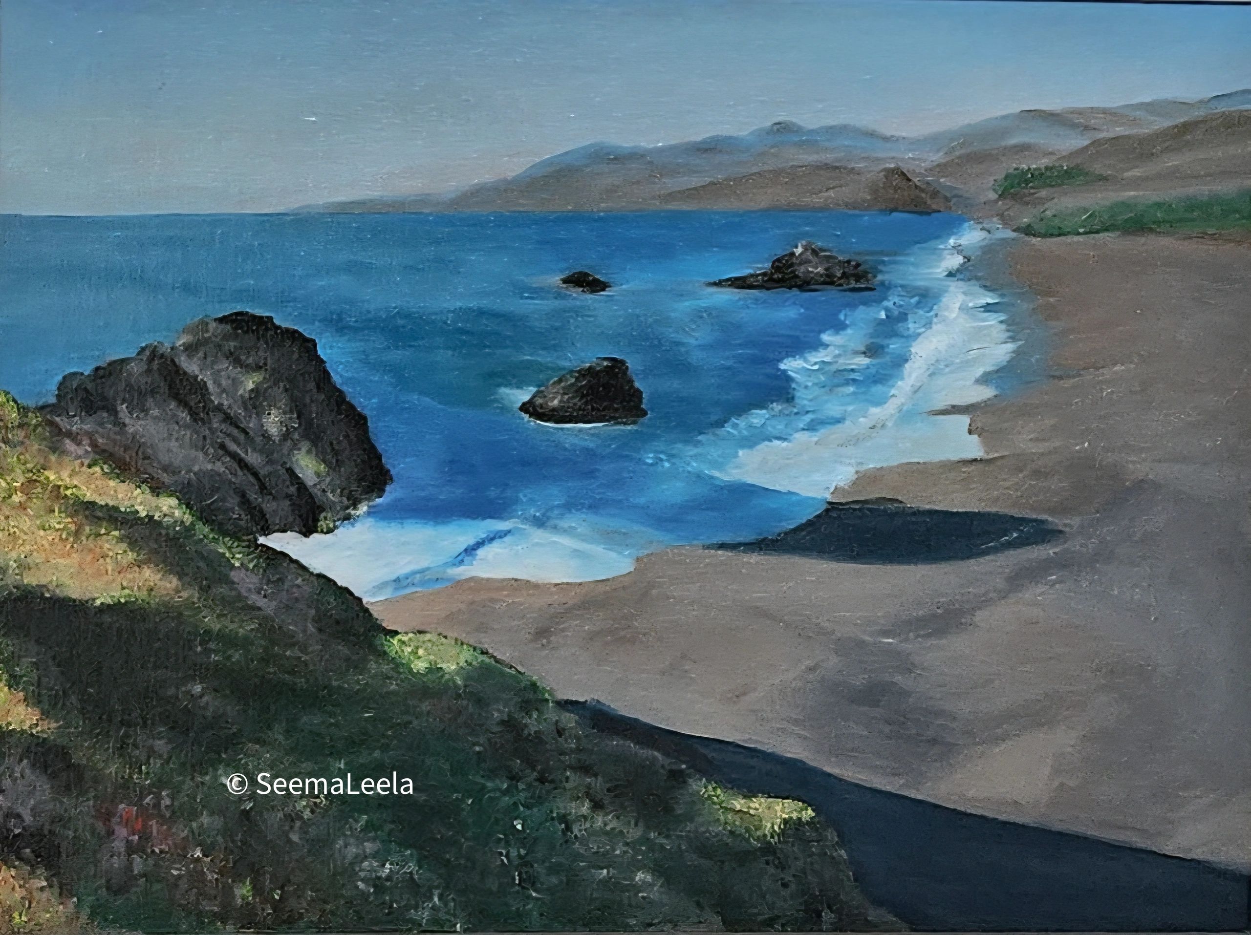 Serene Bodega Bay; Oil on canvas; Framed 11 H x 14 W inches; Price = $475